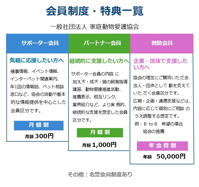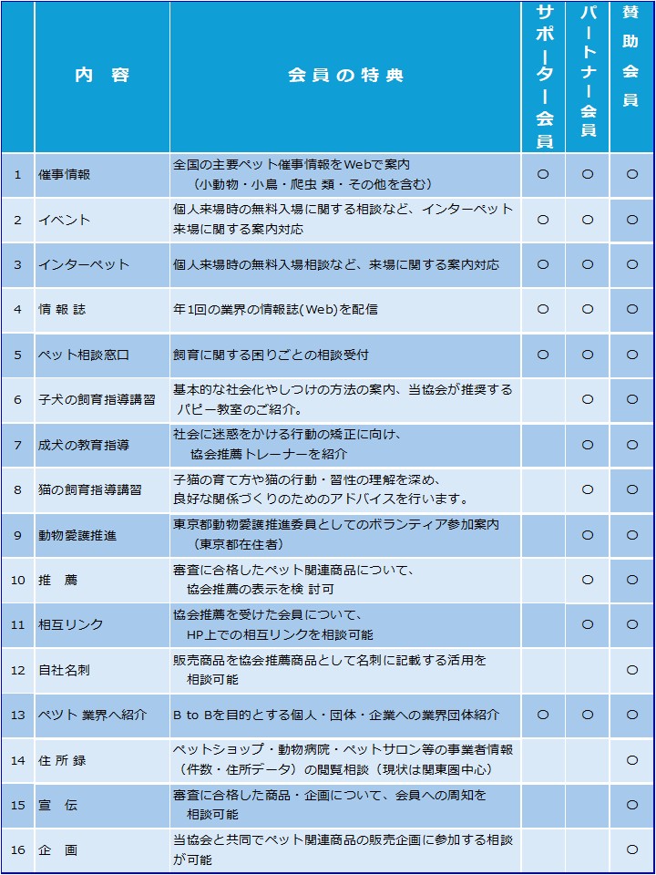 下記の特典は、会員種別に応じてご利用いただけます。当協会では、ペットと人がより良く共生できる社会を目指し、情報提供・相談対応・業界連携など、幅広い活動を行っております。